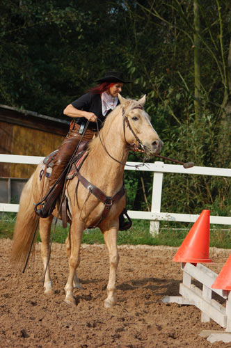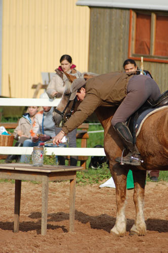 Dann sollte der Reiter vom Pferd aus mit diesem Poloschläger kleine Golfbälle von Pylonen runterschießen. Anschließend ging es über eine Trailbrücke und an einem Tisch sollte der Reiter vom Pferd aus ein Glas einschenken.