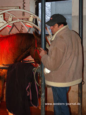 Hier muss man peinlichst darauf achten, das Pferd möglichst trocken zu kriegen. Die Anschaffung gleich mehrerer guter Abschwitzdecken ist schon mal unerlässlich. Nach einer ausgiebigen Trockenreitphase bekommt unser Pferd sein Abschwitzmäntelchen übergelegt und wird weiterhin geführt. Wenn sich die Schweißperlen schon deutlich auf der Aussenseite der Decke zeigen, legt man die nächste Decke auf. Es ist auch wichtig, dass sich das Pferd im Sand wälzen kann - das hilft enorm beim Abtrocknen. Anschließend ist es wichtig, das Pferd mit einer groben Bürste zu bearbeiten. Das hilft gegen den unansehnlichen Strubelpeterlook, der entsteht, wenn das Pferd in diesem Zustand trocknet. Bevor es dann wieder in den Offenstall geht, legen wir eine dicke Winterdecke mit Abschwitzfunktion auf. Die Decke sollte wasserdicht sein, damit sich unser Freund auch bei Regen darin wohl fühlen kann. An diese Deckenmanie muss man sein Pferd aber erst mal mit viel Geduld gewöhnen. Nicht jedes Pferd akzeptiert ein solches Ungetüm auf seinem Rücken. Am Anfang bleiben wir erst mal eine Weile in der Nähe und beobachten die Lage.
