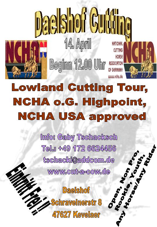 14-03-2007 PREVIEW - Daelshof Cutting in Kevelaer Am 14. April 2007 findet auf dem Daelshof in Kevelaer das Daelshof Cutting Turnier statt. Die Show wird von der NCHA of Germany, der NCHA NL veranstaltet und ist NCHA USA approved. Für die Zuschauer ist der Eintritt frei. Informationen erhaltet Ihr bei Gaby Tschacksch unter der Mobil Nr. 0172-6624456 oder per Mail unter tschacki@addcom.de. Die Ausschreibung und das Nennformular könnt Ihr hier downloaden.