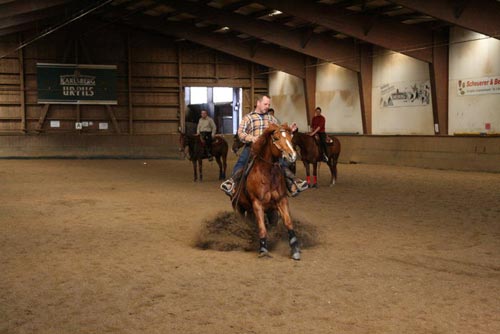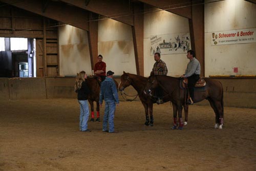 In kleinen Gruppen von 3-4 Schülern gab Levesques sein Wissen an die Deutschen und Französischen Teilnehmer weiter. Der Kurs war sowohl für Anfänger als auch für ambitionierte Turnierreiter geeignet. Schwerpunkt der Clinic war die Disziplin Reining. Abhängig vom Ausbildungsstand der teilnehmenden Reiter und Pferde hat Réjean an vorbereitenden Übungen wie auch am Feinschliff in der Ausführung der spektakulären Manöver gearbeitet.