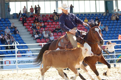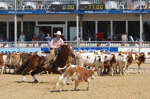 Cutting – Michael Ohlhoff gewann auf Trish La Dish Der mit 2.000 EUR ausgeschriebene Dresdner Bank Rhein-Neckar Cutting Cup zog die Elite dieser Sportart nach Mannheim– sogar aus dem Ausland fanden sich einige Teilnehmer ein. So waren es zwei Starter aus Frankreich, Florence Harache und Alain Boissier – Letzerer hatte leider etwas Pech, da ihm das Rind abhanden kam. Ronald Derrez, der aus den Niederlanden angereist war, startet mit zwei Pferden.