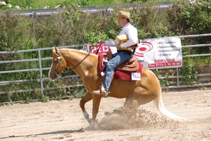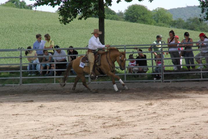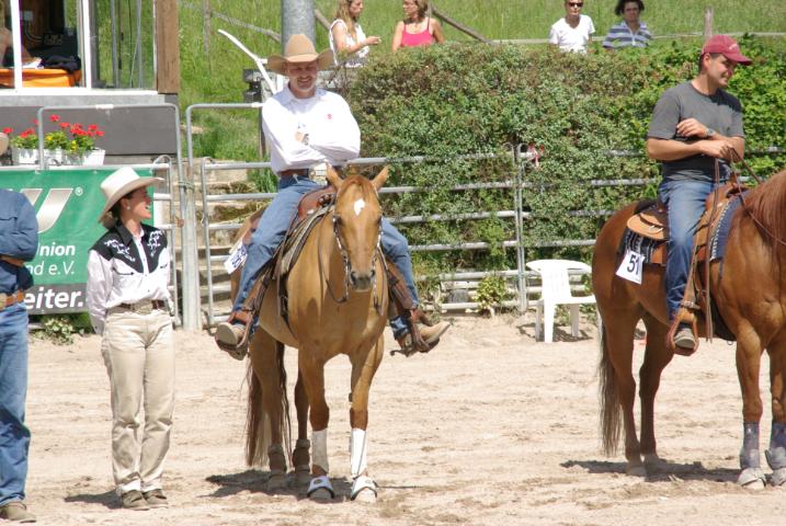 Hans Bauer hat Star Leo San Badger gekauft, damit er ihn später selbst vorstellen kann Er war der einzige, der an diesem Wochenende nicht dabei sein konnte. Der erste Tag bringt der Crew allerdings noch kein richtiges Turnierfeeling. Es regnet unaufhörlich und man wartet auf besseres Wetter – einfach zuviel Zeit zum Trübsaal blasen. Der nächste Tag soll dafür umso besser werden: Star Leo San Badger wird im Trail bei der Jungpferdeprüfung Vierter. Abends kann der zum besten Jungpferd 2006 auserwählte Sohn von Star G Grand Peppy, immerhin noch den achten Platz in der Basis für sich sichern. Die Stute Jokers Bobbie Jo erreicht hier unter Oliver den dritten Platz. Geschafft, der Donnerstag liegt hinter ihnen – nachdem die Pferde versorgt sind, kann der Trainer sich seiner weiteren Aufgabe widmen: dem Coaching seiner Reitschüler, die auch am Turnier teilnehmen. Hier ist er gefordert ein paar Tipps mit auf den Weg zu geben, Manöverkritik zu üben bzw. mit aufmunternden Worten beiseite zu stehen und erst wenn alle Fragen beantwortet sind, kann sich der Trainer in sein Wohnmobil zurückziehen und den Rest des Feierabends genießen.