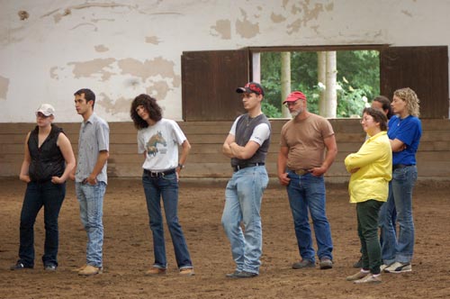 Den Anfang machte am Samstag die „Fortgeschrittenengruppe“, die zu 80 Prozent aus Reitern bestand, die Chucks Programm bereits in einem oder mehreren Kursen kennen gelernt hatten. Hier wurde Gelerntes vertieft, Probleme beseitigt und Unsicherheiten besprochen und aus der Welt geschafft. Ansonsten mussten auch die „Fortgeschrittenen“ lernen, dass jedes Training immer wieder mit den Basics beginnt. Und erst, wenn die Fragen des Reiters an das Pferd mit den richtigen Antworten beantwortet wurden, konnten die Reiter mit den Manövern beginnen.