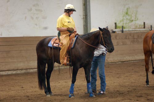 Am Beginn der Clinic stand wie immer das Checken der Ausrüstung, der reiterlichen Fähigkeiten und der Ausbildung der Pferde. Dieses ist mitunter der wichtigste Teil, wenn auch für die Zuschauer nicht so interessant, da die Reiter mit den Pferden sowie der Trainer in der Halle stehen und „nur“ reden, aber bereits hier macht sich Chuck ein Bild, lernt seine Schüler kennen, bespricht die ersten Probleme.