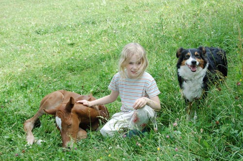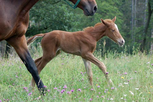 Nun steht die kleine Madame schon auf der Weide und erfreut sich seiner vier Beine, die noch nicht wirklich gut zu steuern sind. Ein herrlicher Anblick bietet uns ihre erste Galoppade.