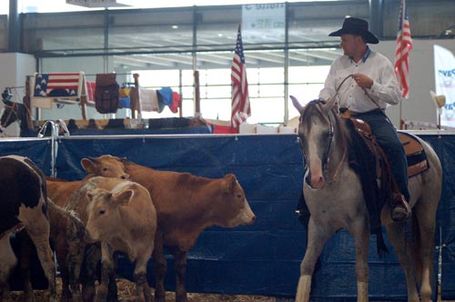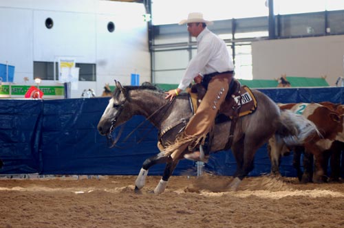 Als gegen 14.30h der erste Go begann, war am Großen Ring in Halle 3 kein freies Aussichtsplätzchen mehr zu bekommen. In mehreren Reihen hintereinander scharrten sich die Interessierten und der DQHA Vizepräsident Jochen Frank musste die erste Reihe mehrmals bitten, sich doch zu setzen, damit auch die hinteren Zuschauer etwas von dem Geschehen mitbekommen. Es fehlte leider die Erklärung dieser Westerndisziplin - so war sicher vielen Zuschauern nicht ganz klar, warum gerade die spektakulärsten Ritte nicht gleich die Gewinner waren.