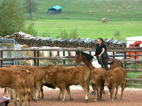 Bei diesem Kurs war alles vertreten: vom Freizeitreiter, Trainer B und C, bis zum Profitrainer Nach den Vorstellungen ging es um 9 Uhr los. Alle Reiter waren auf dem Platz für eine erste Begegnung mit den Rindern, für die war das ganz was neues, so wie für die meisten der Pferde. Da war schon ein wenig Spannung zu fühlen, die mit den gezielten Anweisungen von Ute aber rasch verflog.