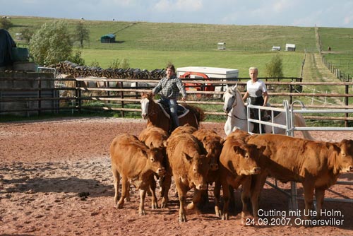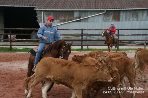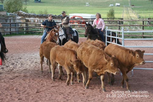 Dann wurden die Rinder frei gelassen - da kamen wir dem „Cutting“ schon näher. Die Aufgabe war es, mit zwei Helfern ein bestimmtes Rind aus der Herde zu holen. Nach und nach kam jeder an die Reihe, manche Pferde machten das gleich ganz cool, andere brauchten etwas länger. Aber es haben sich alle ganz ruhig verhalten.