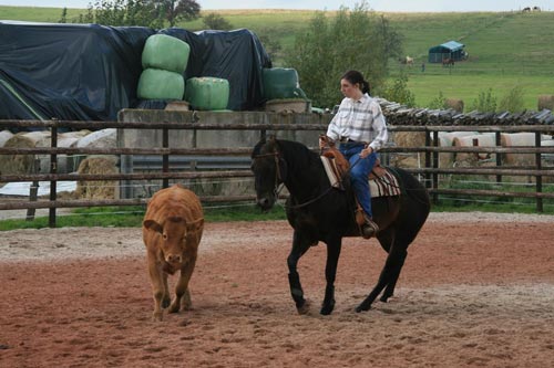 Auch die Veranstalter Elke und Gerd Diebold waren mit der Quarter Horse Stute TL Contoureds Easter und der Paint Stute Cherokees Apanachie aktiv am Kurs beteiligt. Sie können das Erlernte gleich mal Zuhause an der hofeigenen Rinderherde umsetzen.