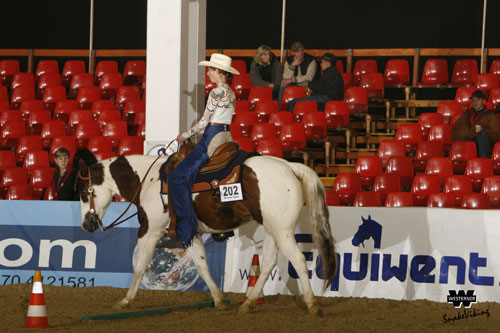 Vorlauf LK 1/2 A Junior Western Riding Vorlaufsieg für Björn Kurzrock Etwas verhalten wurde der Vorlauf der Junior Western Riding erwartet, waren doch vergangenes Jahr beim Debüt dieser Prüfung auf einer Deutschen Meisterschaft der EWU die gezeigten Ritte unter den Erwartungen geblieben. Die Überlegung, diese Prüfung wieder ganz aus dem Programm der German Open zu verbannen, wurde dann aber doch beiseite geschoben. Nachdem im vergangenen Jahr mit lediglich vier Startern der Vorlauf wegfiel, wurde dieses Jahr zum Vorteil für diese Prüfung eine Vorentscheidung nötig. Insgesamt haben sich die Vorstellungen der Pferd-Reiter-Paare im Vergleich zum Vorjahr deutlich gesteigert. Durchaus anspruchsvolle Vorstellungen der jungen Pferde waren zu sehen. Ein Score von zweimal 64 war schließlich nötig, um ins Finale der 16 Teilnehmer starken Disziplin einzuziehen. Am besten stellte Björn Kurzrock seinen Hengst No Chip Sherlock vor. 19 Platzierungspunkte bedeuteten Platz Eins für ihn, mit knappem Vorsprung vor seiner stärksten Konkurrenz, Hiltrud Rath mit Ima Cool Te N Te – übrigens die Titelverteidigerin in dieser Prüfung – und Diana Dammann auf Remmy Demmy, die beide auf 28 Zähler kamen und sich damit vom restlichen Teilnehmerfeld absetzten. Ob diese drei das Finale unter sich ausmachen werden, wird am Sonntag zu sehen sein. George Maschalani führte schließlich die weitere Platzierung an. Auf Tristar Romeo konnte er 24 Platzierungspunkte für sich verbuchen und belegte damit Rang Vier. Mit zweimal 23 Punkten wurde der fünfte Platz doppelt vergeben, und zwar an Carmen Weber-Rueß auf Cielo Hot Smokin sowie Rebecca Schwarzburger, die My Skippy Dandy Dawn (beide 23 Punkte) vorstellte, mit dem sie am Freitagmorgen den Deutschen Meistertitel der EWU in der Junior Western Pleasure stolz entgegennahm und sich hier noch eine weitere Medaillenchance wahrte. Die weitern vier zu vergebenden Tickets ins Finale holten sich in dieser Reihenfolge Patrick Sattler mit Sesquis Gorgeous Gal (18), Adelheid Baur auf Rescue Remedy (16), Franziska Häger und DD King Freckles (15) sowie Martina Doritke, die mit Highlander Te Too auf 14 Punkte kam. Letztgenannte gewann die Silbermedaille in dieser Disziplin im vergangenen Jahr.