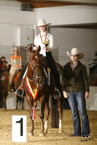 Einstimmiger Sieg für Rebecca Schwarzburger Im Vergleich zum Vorlauf noch einiges ändern sollte sich im Kampf um Titel und Medaillen in der Junior Western Pleasure. Die Ergebnisliste aus dem Go sah doch deutlich anders aus als die Platzierung im Finale – hier wurden eben die Karten völlig neu gemischt. Die Entscheidung um den Deutschen Meistertitel der EWU in der Junior Western Pleasure fiel trotzdem mehr als eindeutig aus. Einstimmig setzten die Richter Rebecca Schwarzburger und My Skippa Dandy Dawn, einen sechsjährigen Quarter Horse-Wallach, auf den ersten Rang; 33 Platzierungspunkte für dieses Paar. Ganze acht Punkte Abstand zur Zweitplatzierten machte die Medaillenfrage zumindest unter den ersten zwei Rängen unstrittig. Doch Platz Zwei, Drei und Vier lagen wieder dicht beieinander. Die Silbermedaille und den Vizemeistertitel der EWU nahm mit 25 Punkten schließlich Hiltrud Rath auf Ima Cool Te N Te, Dritte des Vorlaufs, in Empfang. Es folgte dichtauf Taina Doert, die sich über die Bronzemedaille freuen konnte. Undeniably Deluxe hieß das Pferd, das sie mit 24 Punkten durch die Arena steuerte.