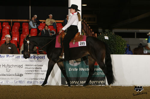 Eine ganz, ganz knappe Entscheidung fiel in der Western Riding der Jugendlichen. Zweimal 29 Platzierungspunkte bedeuteten einen Tie zwischen Madleen Lehmann und Maria Stellberg. Das nötige Quäntchen Glück auf ihrer Seite hatte schließlich Madleen Lehmann, die mit ihrem Paint Horse Teximpressive einen sehr schönen Ritt zeigte. Den Deutschen Meistertitel der EWU in der Western Riding also für sie! Bereits im Vorlauf hatte sie mit dem dritten Rang Anspruch auf eine Medaille angemeldet, und konnte sich nun sogar an die Spitze setzen. Ebenfalls eine tolle Leistung zeigte Maria Stellberg auf Leos Sugar Doc Olena, die durch die Tie-Richterentscheidung die Silbermedaille und damit den Vizemeistertitel entgegennehmen konnte. Sie zeigte einen sehr sauberen Ritt, aber verlor durch zwei Penalties die möglichen entscheidenden Punkte für Gold. Kräftig steigern konnten sich im Finale Nele Sauer auf Domino. Während sie als Zehnte ins Finale einzog, schaffte sie im Endlauf mit 24 Platzierungspunkten den Sprung aufs Treppchen! Einstimmig gaben ihr alle drei Richter jeweils acht Platzierungspunkte – das war die Bronzemedaille. Konstante Leistung zeigte Chatrine Ackerle mit Taris San Cita, die sich von Platz Fünf im Vorlauf nun auf Platz vier verbessern konnte. Mit 19 erzielten Platzierungspunkten war der Abstand zu den Medaillenrängen allerdings erkennbar. Platz Fünf belegte Joanna Pohl auf Cougarand Chrome, die den Tie-Richter auf ihrer Seite hatte, denn Kim Blockus kam mit Bentley Dellorian Ace ebenfalls auf 18 Punkte. Sie rutschte dann aber auf Platz Sechs, gefolgt von Bettina Höschele, die Bavarian Linkage zu 13 Punkten durch die Pilonen steuerte. Im Vorjahr hatten diese beiden die Bronzemedaille gewonnen. Kathrin Rüdinger auf Luna kam im Finale auf neun Zähler, die Rang Acht bedeuteten. Damit rutschte sie zwei Plätze nach unten im Vergleich zum Vorlauf. Pech hatte auch Nicola Salger, die mit Gismo (6) noch im Vorlauf mit Rang Vier Medaillenanspruch anmeldete, aber diesmal nicht über Platz Neun hinauskam. Noch mehr Pech hatte Felix Schnabel, der auf Instant Inpulse mit einer tollen Vorstellung schon auf Medaillenkurs in der Arena unterwegs war, als sein Pferd auf einmal ein „Schreckgespenst“ im Publikum sah und wie angewurzelt stehen blieb. Wirklich sehr schade für diese beiden. Aber solche Zwischenfälle sind im Pferdesport schnell passiert. Dabei hatte Felix im vergangenen Jahr bereits ein ähnliches Erlebnis mit Cinderella Slider im Finale der Superhorse. Trotzdem löste er die Situation mit wahrer Horsemanship und stieg ab, um seinem Pferd in aller Ruhe die vermeintliche Gefahr zu zeigen.