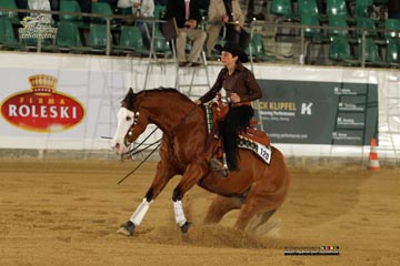 Claudio Risso hat es erneut geschafft: nachdem der Italiener die erste European Futurity Non Pro 2009 gewonnen hatte, ritt er diesmal den Halbbruder seines damaligen Futurity Champions, RS Barbaresco Blue (Spat A Blue x NMSU Bonitas Jo x Lenas Bonita) auf Platz 1 in der KL Performance Horses Level 4 Non Pro Futurity. Der von Claudio Risso gezüchtete Hengst lag nach dem Vorlauf auf Platz 5 (211) und konnte sich im Finale nochmals erheblich steigern. Nach einem für Claudio typisch risikoreichen Ritt verließen die beiden mit einer 216 die Bahn. Das bedeutete den Sieg in der Level 4 Non Pro. RS Barbaresco Blue war unter Gennaro Lendi Level 4 Open Finalist der NRHA Germany Breeders Futurity SBH Open 2012. Claudio Risso hat damit erneut bewiesen, dass er einer der besten Non Pros Europas ist. Der vielfach erfolgreiche Züchter, der mehrere Jahre in Folge Leading Breeder der NRHA Germany war, war u.a. NRHA World Champion und Reserve World Champion Non Pro, mehrfach NRHA Breeders Futurity Champion und multiple Bronze Trophy Champion.